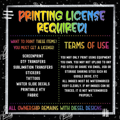 - YOU CANNOT PRINT TRANSFERS, STICKERS, FABRIC, PRINTABLE VINYL, ETC. WITHOUT A PRINTING LICENSE!