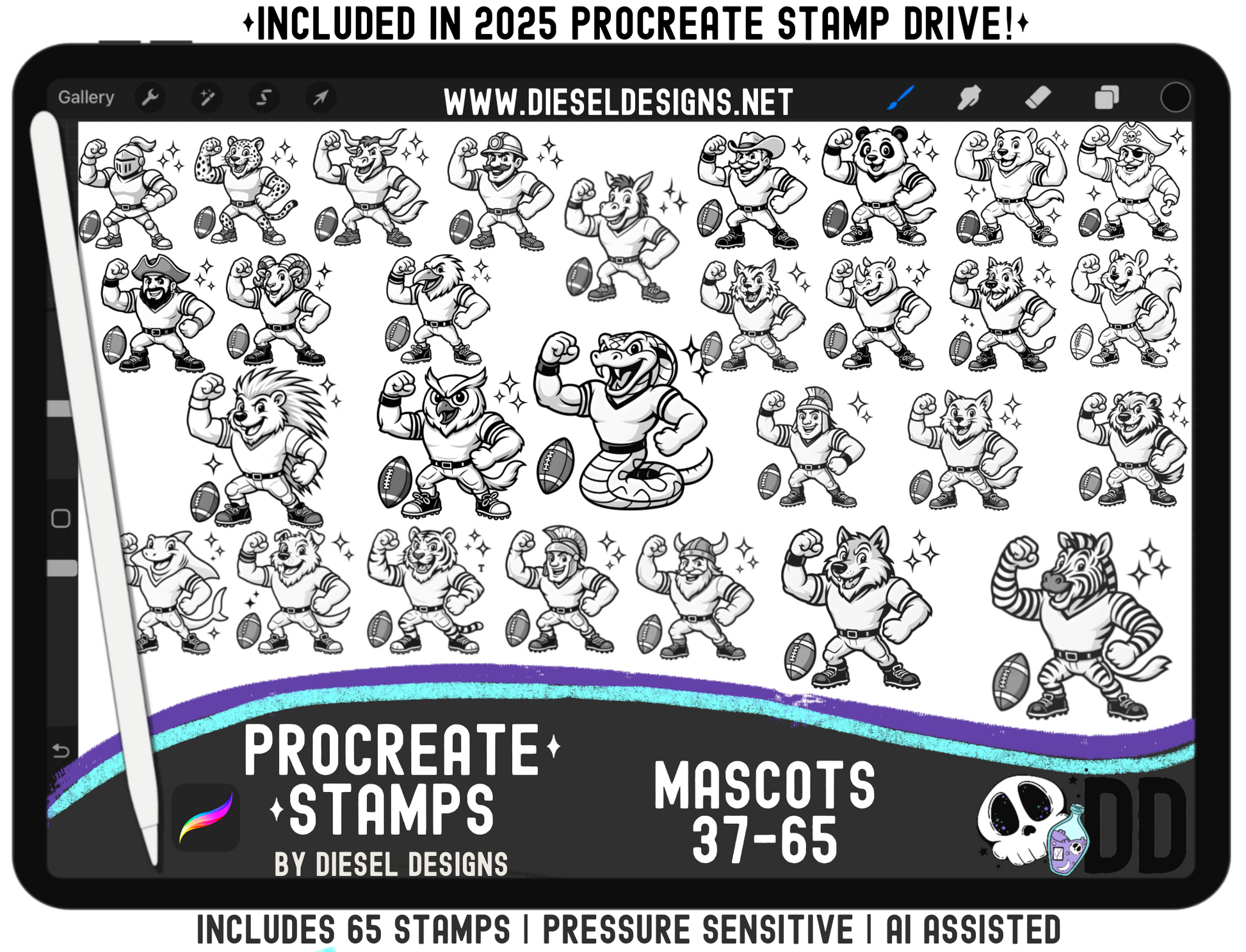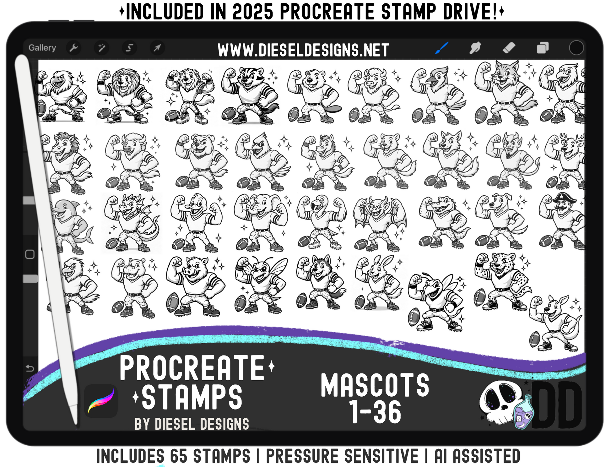 Mascots Procreate Stamp Mega Set — All 65 Pressure‑Sensitive Sports Mascots for Fast Team Art (iPad + Apple Pencil)