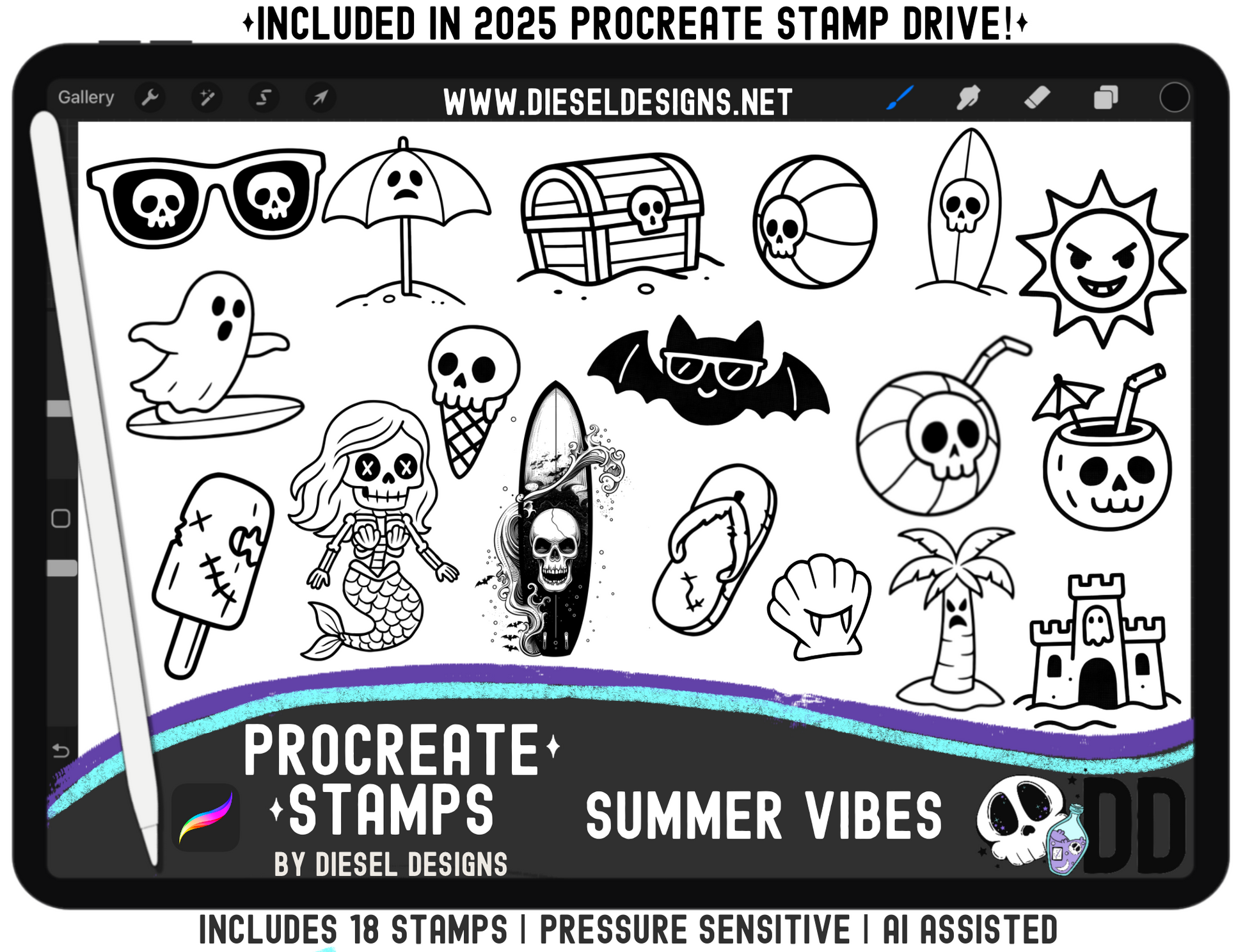 procreate stamps, summer vibes stamps, spooky summer clipart, skull sunglasses, ghost popsicle, skull beach ball, bat sunglasses, vamp sun, spooky surfboard, palm tree stamp, sandcastle stamp, seashell stamp, coconut drink skull, treasure chest stamp, beach set brush, procreate brushset, apple pencil pressure, sublimation stickers, tumbler wrap graphics, diesel designs
