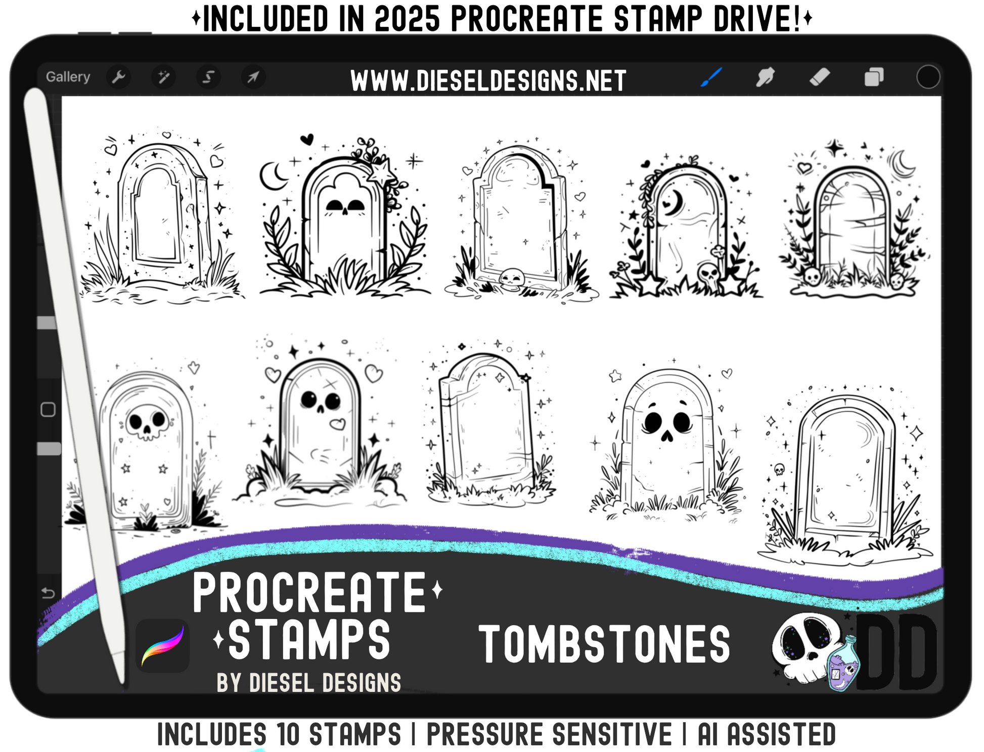 Tombstones Procreate Stamp Set — 10 Pressure‑Sensitive Grave Marker Stamps for Spooky Halloween Art (iPad + Apple Pencil)