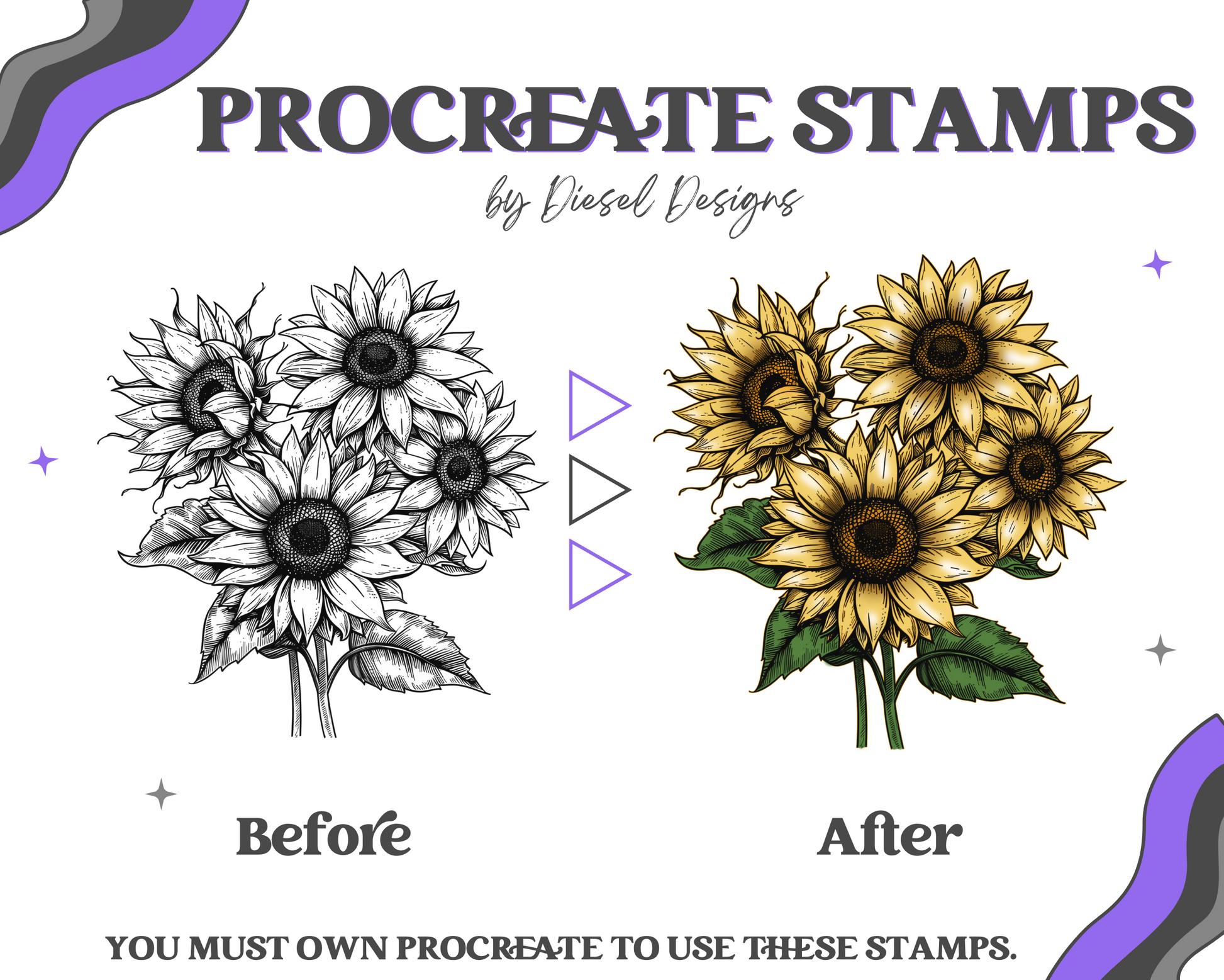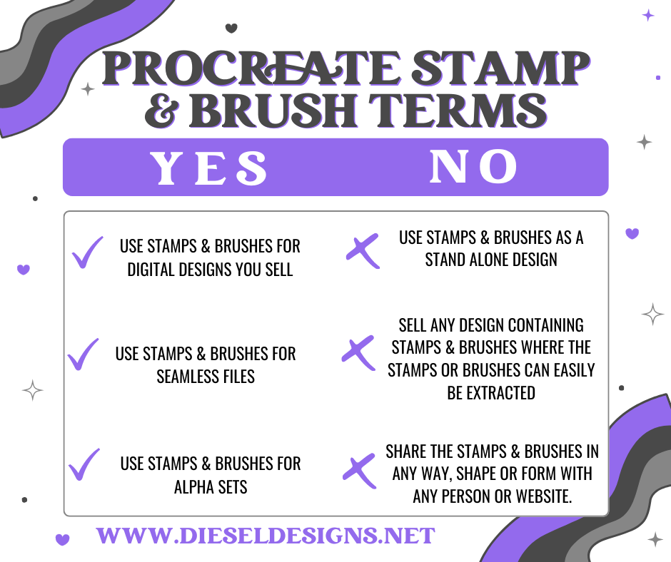 - Designs created by you using Diesel Designs procreate brushes and stamps must not be similar to any Diesel Designs completed design available. This is to help ensure Diesel Designs remains exclusive with their designs.